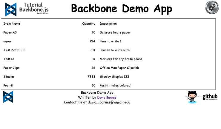 Github CodeSmall demo application showing how to use backbone.js to create a client side application. The application allows a user to expand a row in the list of inventory to show the details of the item. Information can be updated and saved.