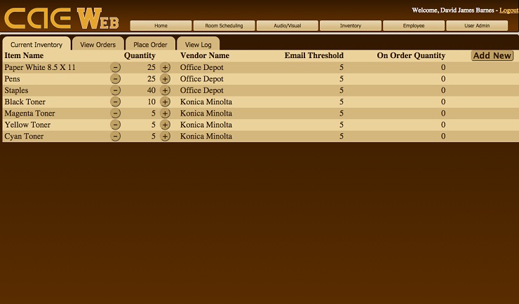 Application that provides room scheduling for 34 rooms at WMU's College of Engineering and Applied Sciences, an inventory control system, log entry for AV equipment work, and an employee section that provides clocking in and out, work scheduling, and timesheet management.