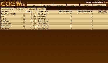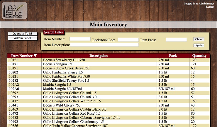 In development application to keep track of warehouse inventory amounts and locations for Paw Paw Wine Distributors. Features include: Tracking movement of stock between trucks, warehouse locations, and delivery staging areas. Generate various related reports.